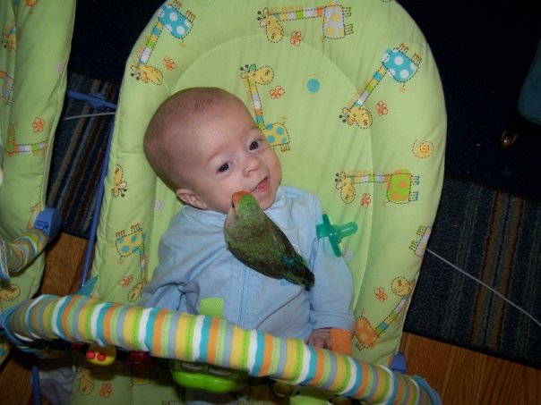 When we brought the boys home from the hospital, we wondered how Polly would do with two little people competing for her attention. She was the perfect "big sister"--the first thing she did was preen Micah's head by running her beak down his fine downy hair.  She preened and licked his head for about 5 minutes. It was the sweetest thing ever.